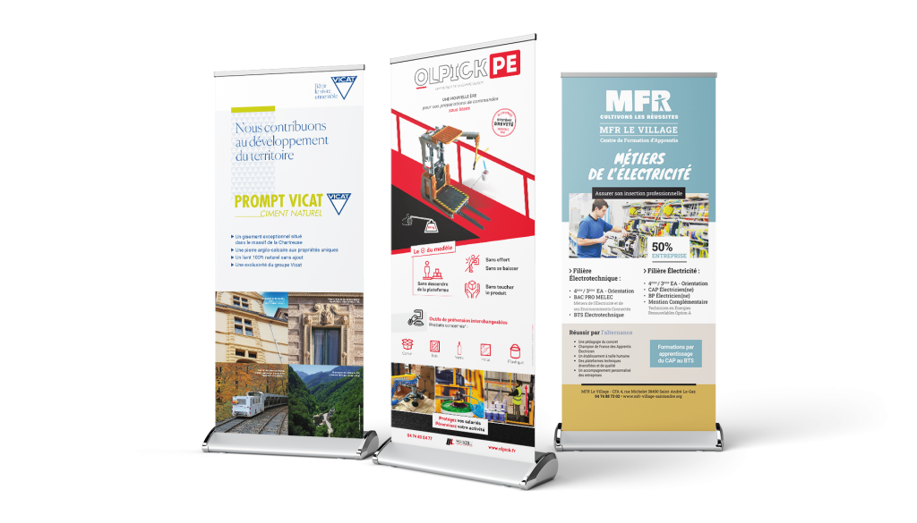 Le Roll–up est un kakemono pouvant se plier et se déplier facilement. Aussi appelé kakemono avec enrouleur, le roll-up se transporte ainsi facilement et se déploie en quelques minutes. Pratique et offrant une forte visibilité, le kakemono roll-up est idéal pour tout type d’évènements professionnels.